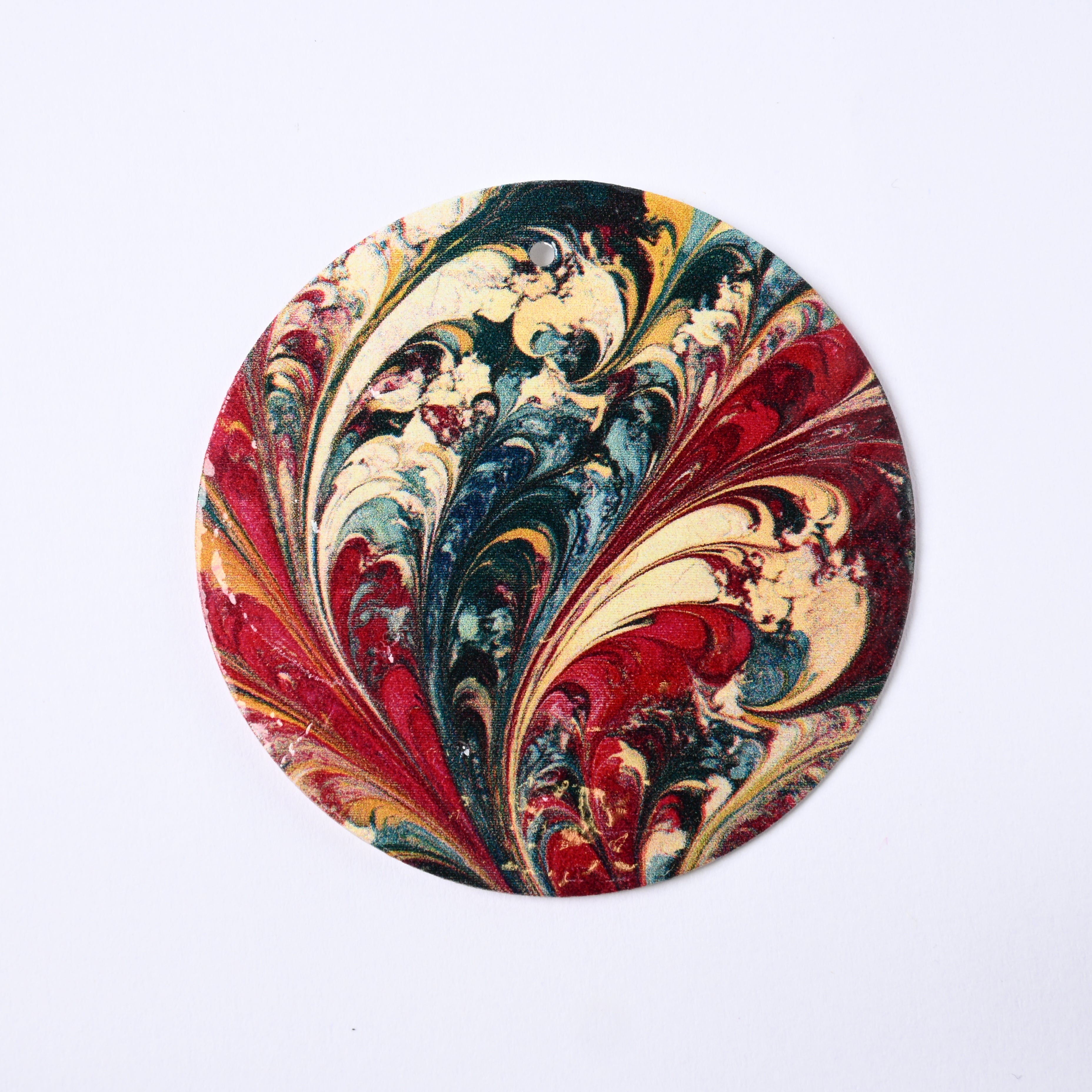 La base in madreperla fornisce un'iridescenza unica e una lucentezza cangiante che reagisce alla luce, donando profondità al motivo grafico. La sua naturale leggerezza lo rende un componente ideale per orecchini e collane.