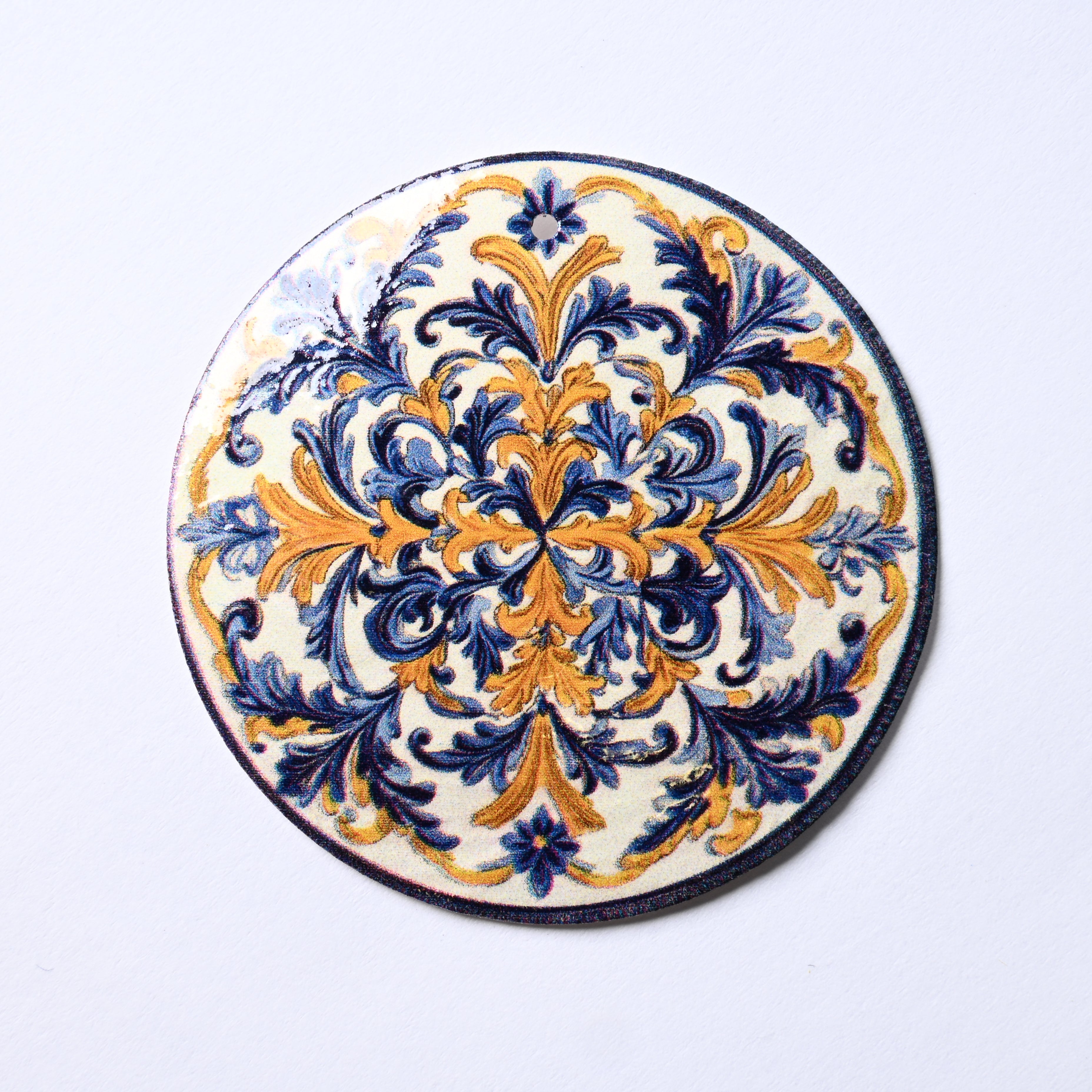 La base in madreperla fornisce un'iridescenza unica e una lucentezza cangiante che reagisce alla luce, donando profondità al motivo grafico. La sua naturale leggerezza lo rende un componente ideale per orecchini e collane.