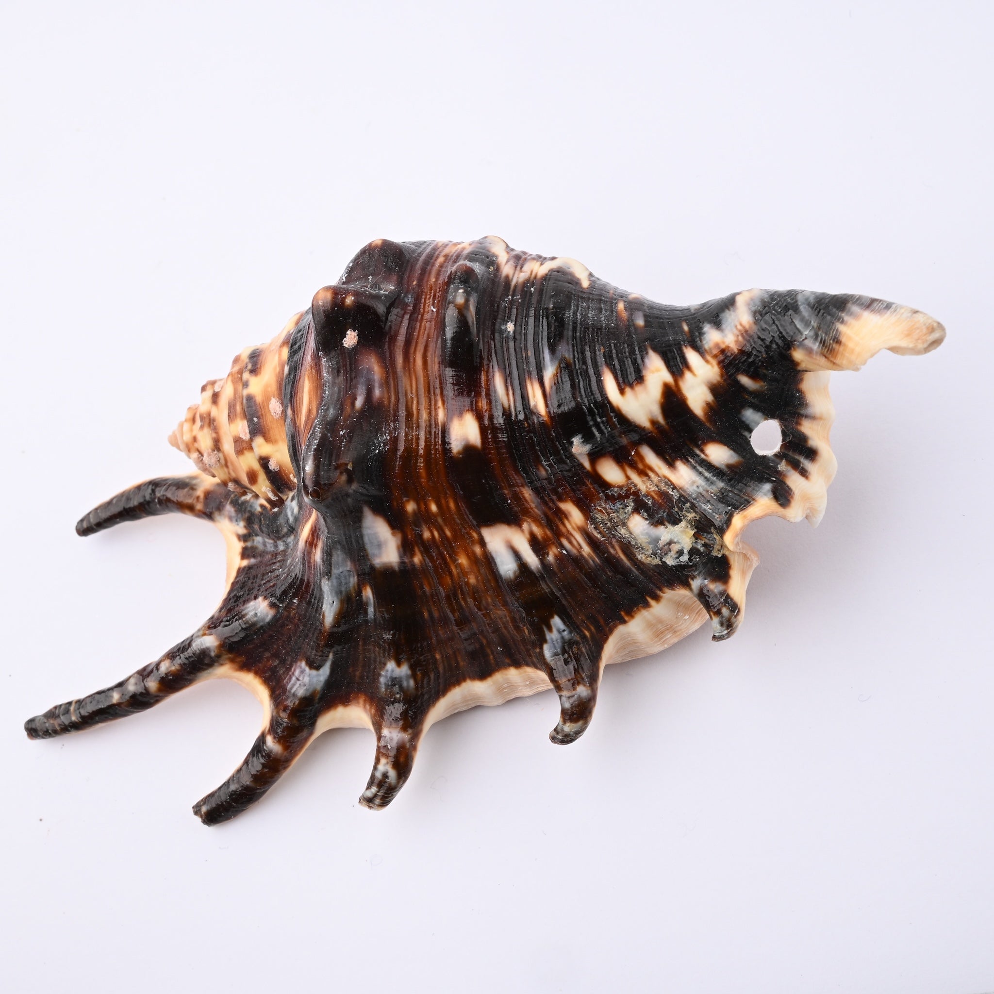 La Lambis Lambis Dark è una rivisitazione ombrosa e affascinante della classica conchiglia ragno. In questa variante, le tonalità chiare lasciano il posto a una palette profonda e decisa: il guscio è dominato da macchie e striature color cioccolato fondente, caffè tostato e nero, che avvolgono la superficie e le caratteristiche "dita" ricurve. Questo aspetto "bruciato" e misterioso ne accentua la silhouette scultorea, rendendola un accessorio dal forte carattere tribale e gotico-chic. Già dotata di foro, è il pendente perfetto per chi cerca un gioiello naturale che esprima forza e personalità, ideale da abbinare a cordini in cuoio scuro o catene brunite.