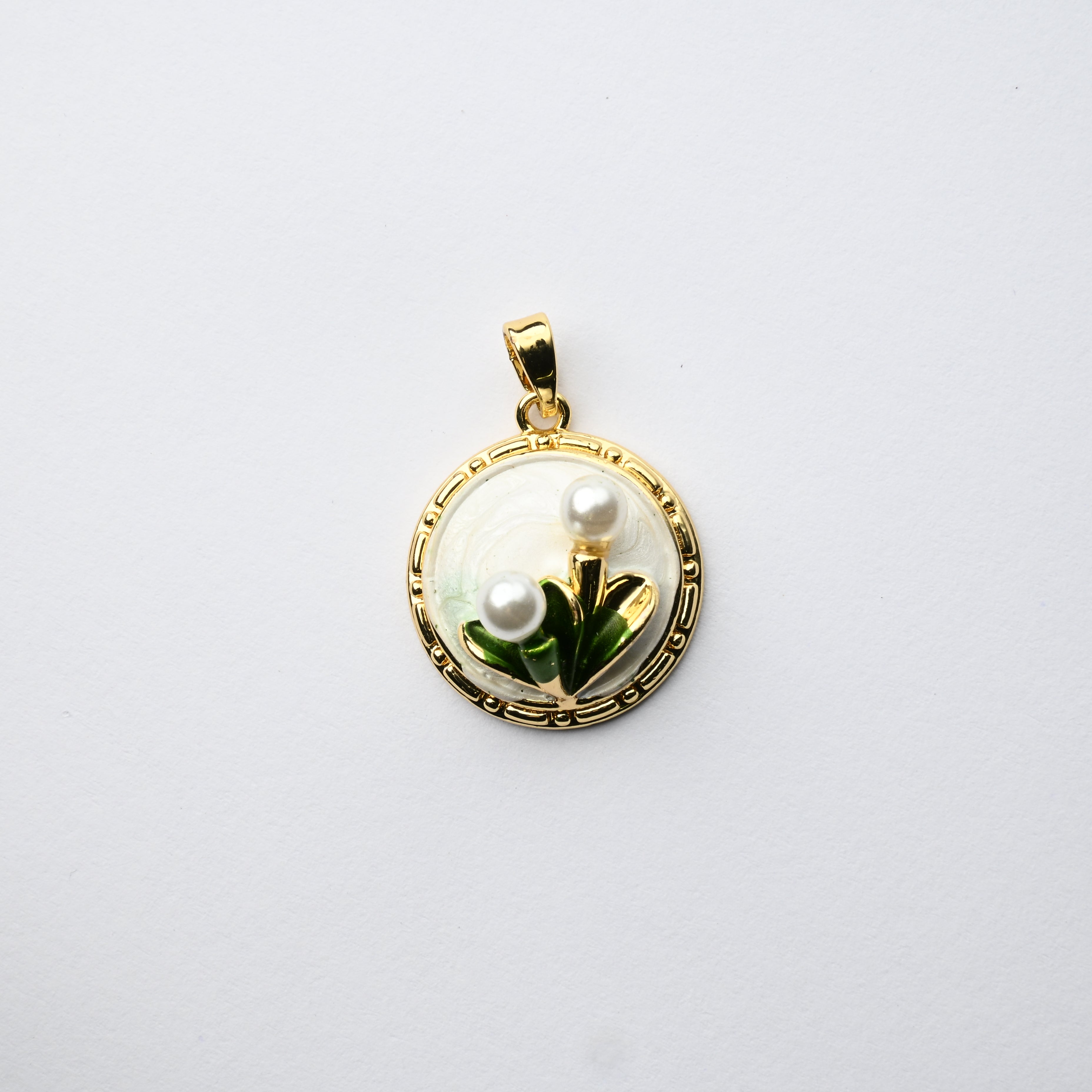 Ciondolo "Due Boccioli di Perla" e Foglie su Smalto Bianco Tondo 18mm - Artigianale