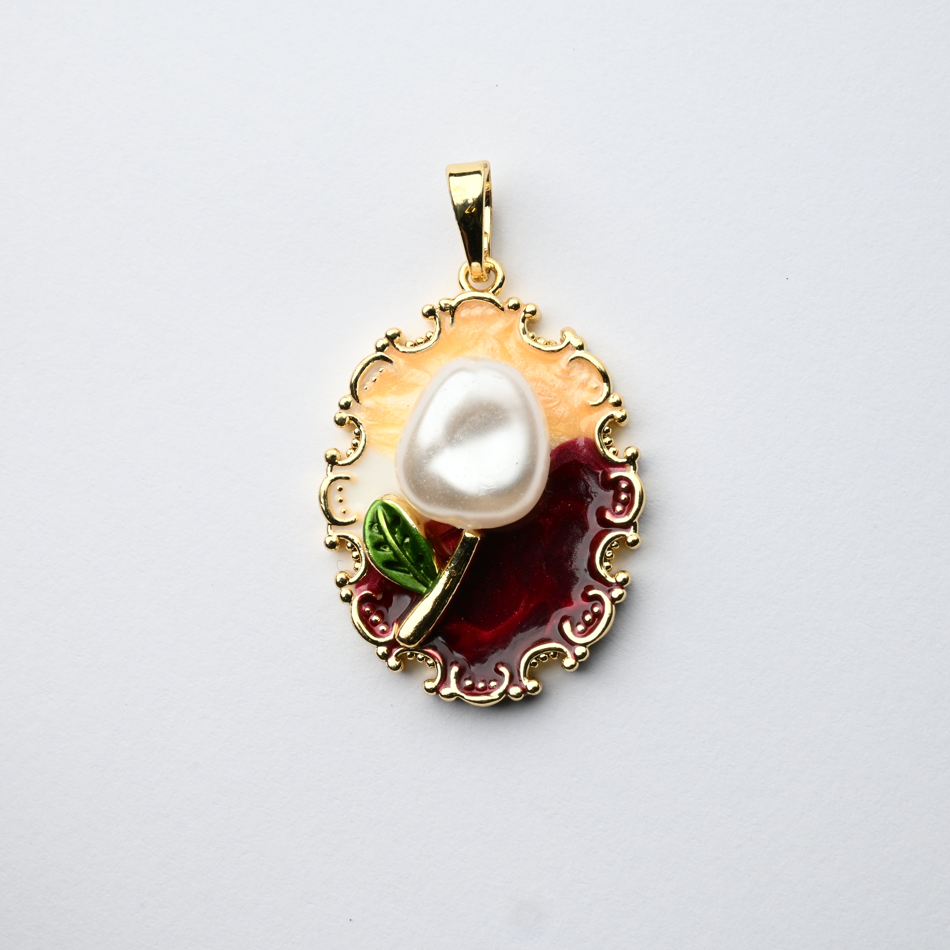 Ciondolo "Bocciolo Perla" su Smalto Bordeaux, Bianco e Arancione Ovale 28x22mm - Artigianale