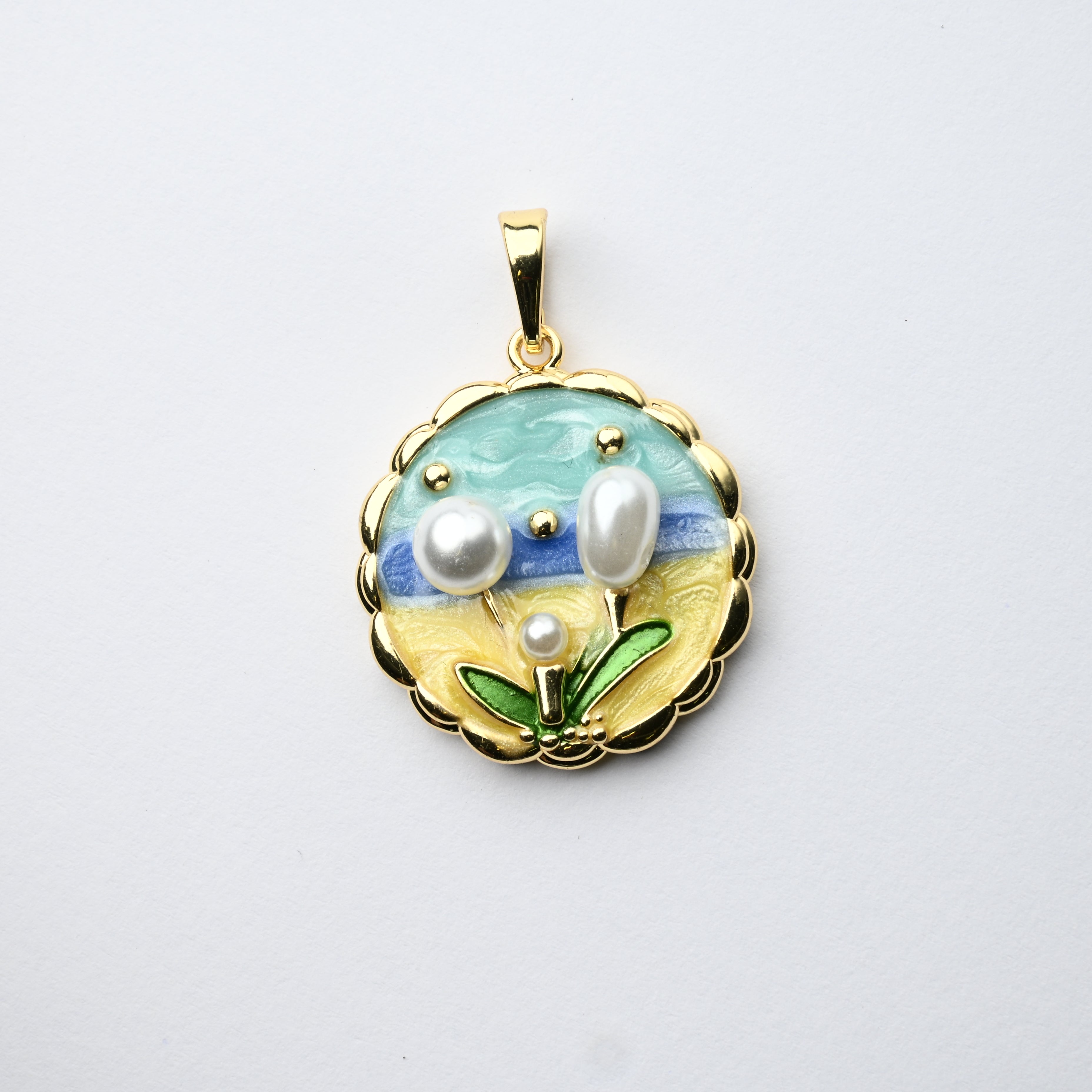 Ciondolo "Paesaggio Estivo" con Tulipani e Cielo Azzurro Tondo 23mm - Artigianale