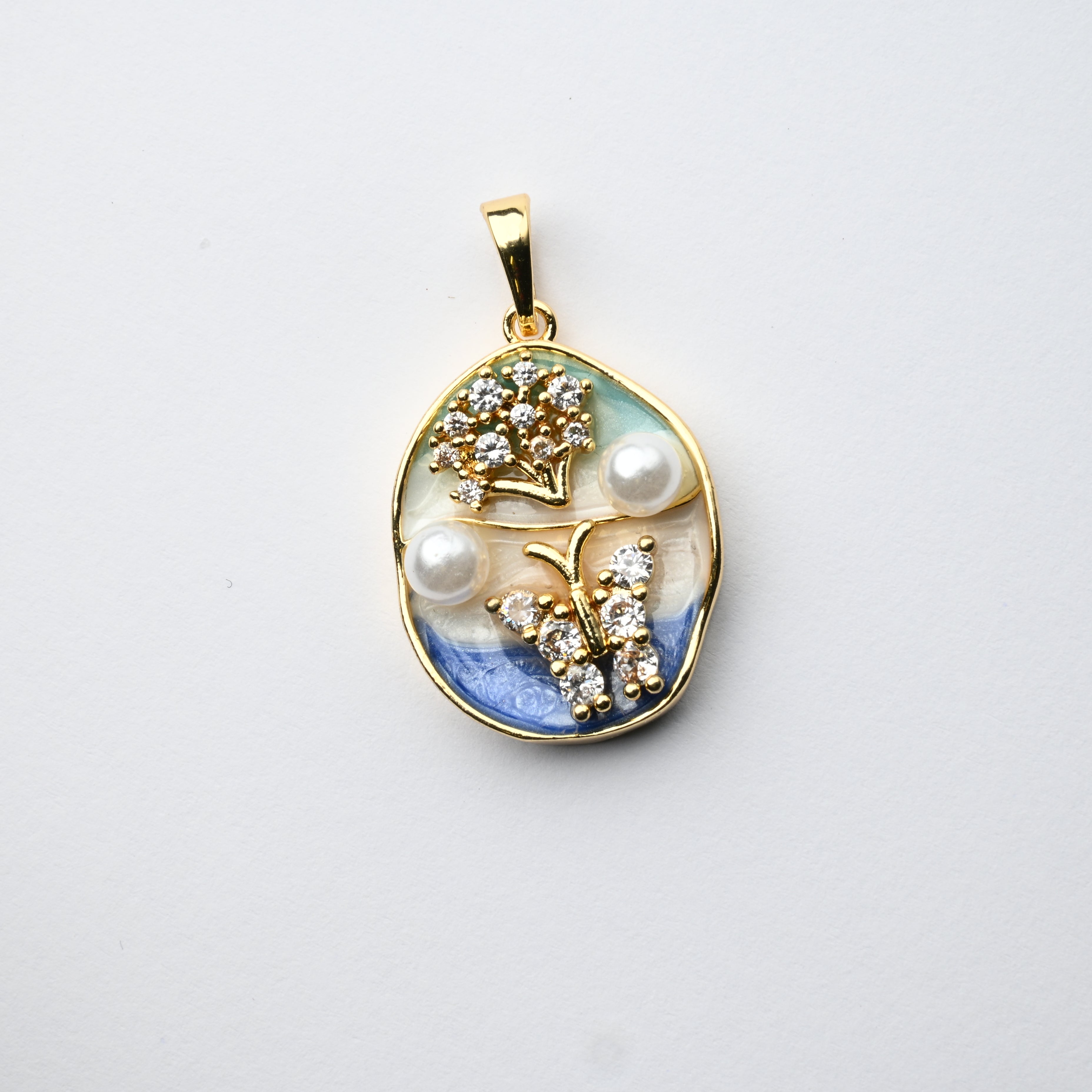 Ciondolo "Paesaggio Incantato" con Albero e Farfalla di Cristalli Ovale 24x19mm - Artigianale