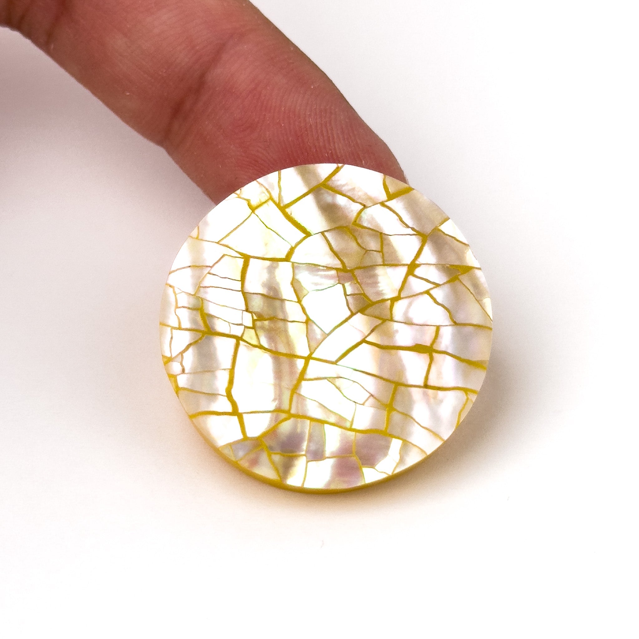 Un pezzo unico della nostra Collezione Artigianale "Luce d'Avorio". Questo componente unisce la lucentezza naturale della madreperla alla profondità della resina, in una delicata armonia di tonalità avorio.