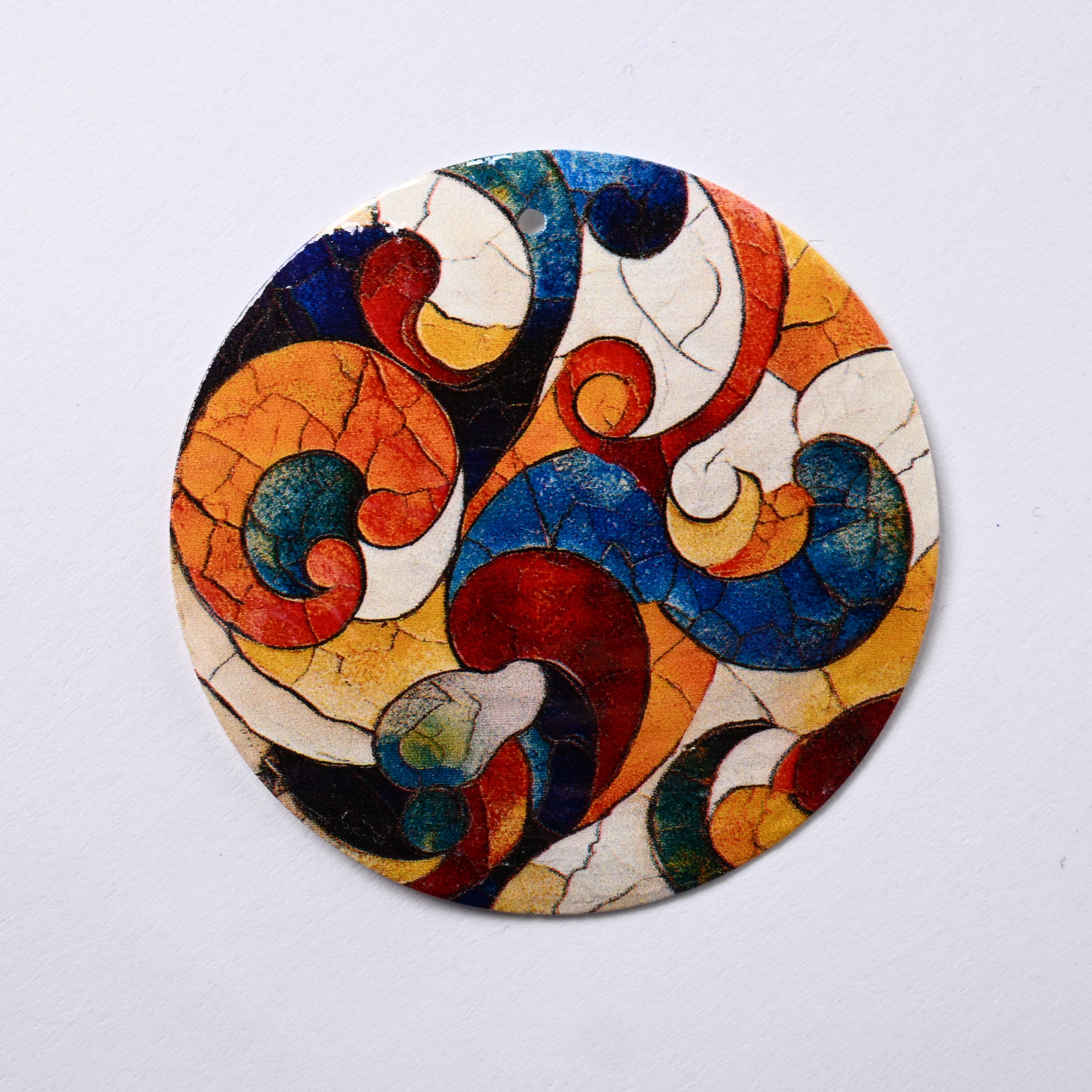 La base in madreperla fornisce un'iridescenza unica e una lucentezza cangiante che reagisce alla luce, donando profondità al motivo grafico. La sua naturale leggerezza lo rende un componente ideale per orecchini e collane.
