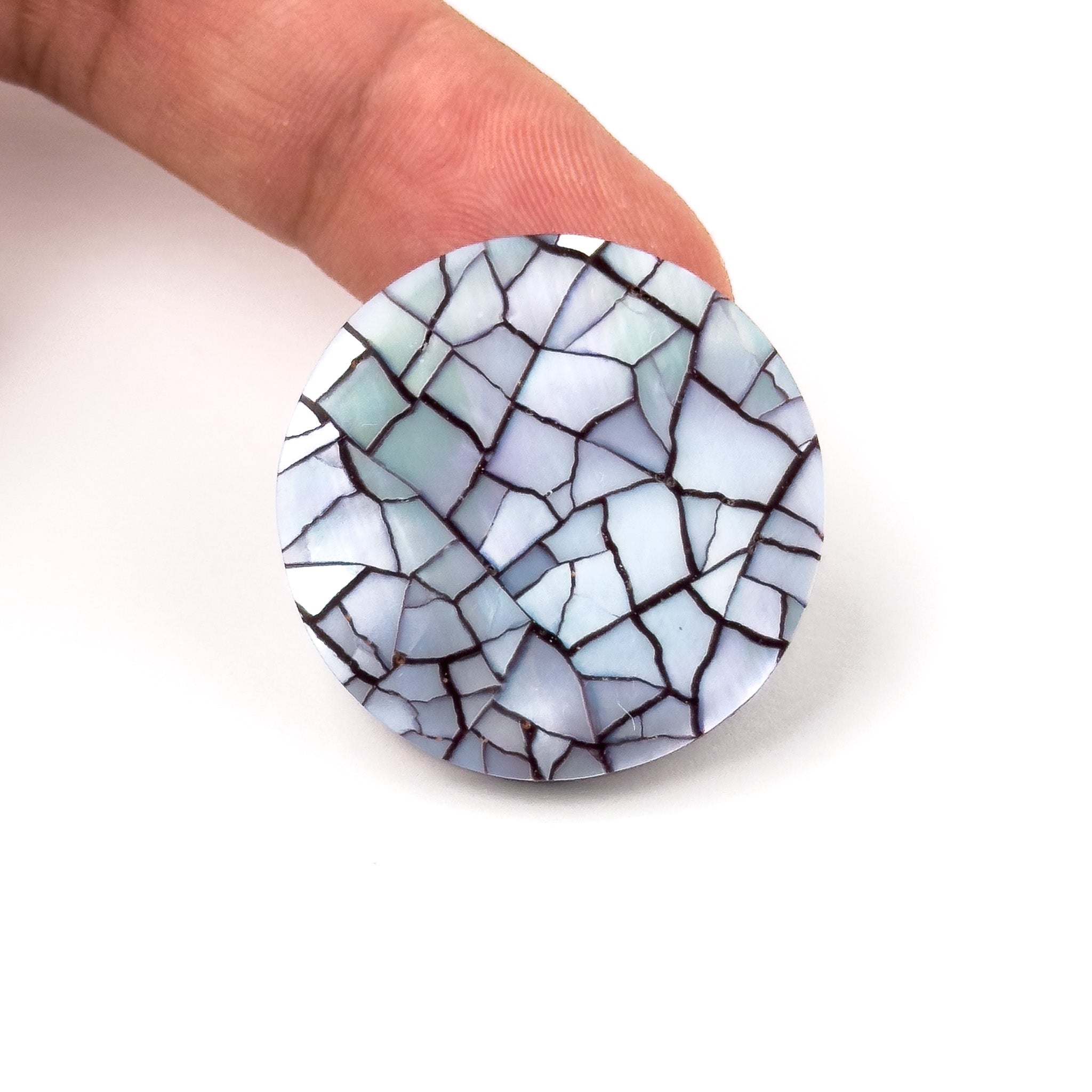Un pezzo unico della nostra Collezione Artigianale "Luce d'Avorio". Questo componente unisce la lucentezza naturale della madreperla alla profondità della resina, in una delicata armonia di tonalità avorio.