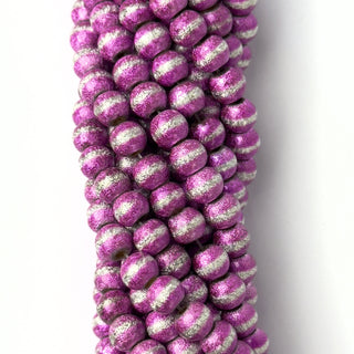 La sapiente inclusione della foglia argento rende ogni perlina leggermente unica, con variazioni nella distribuzione e nella texture dell'argento che ne esaltano il carattere artigianale e prezioso.