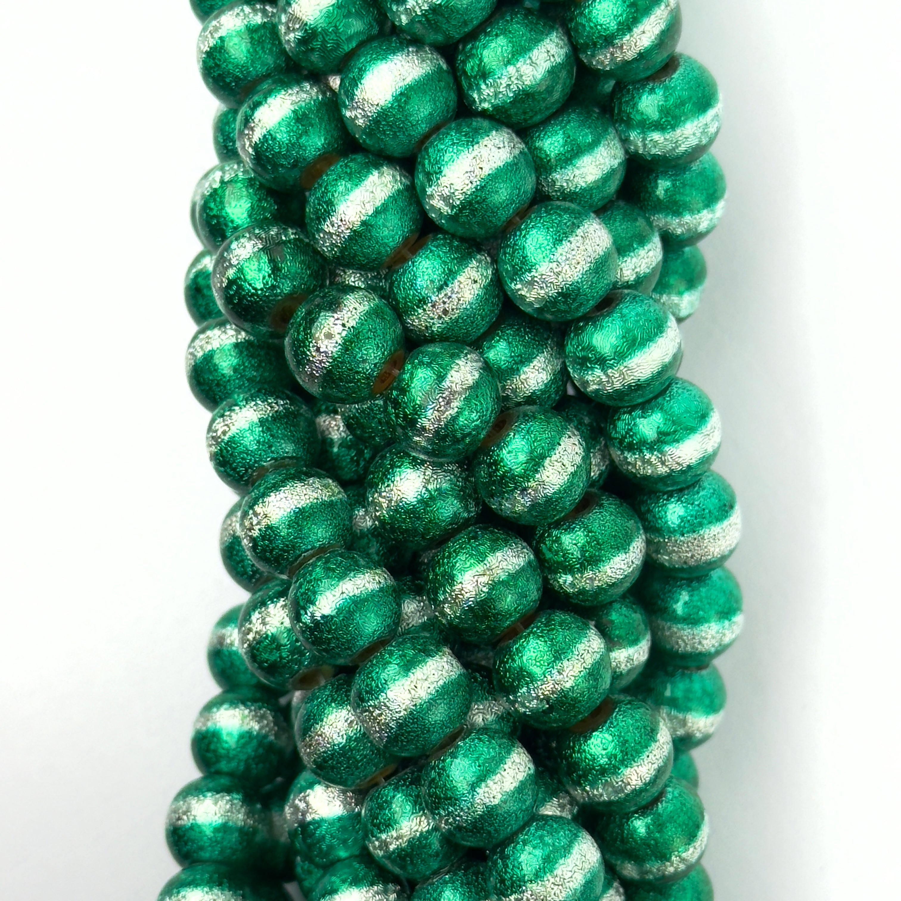 La sapiente inclusione della foglia argento rende ogni perlina leggermente unica, con variazioni nella distribuzione e nella texture dell'argento che ne esaltano il carattere artigianale e prezioso.
